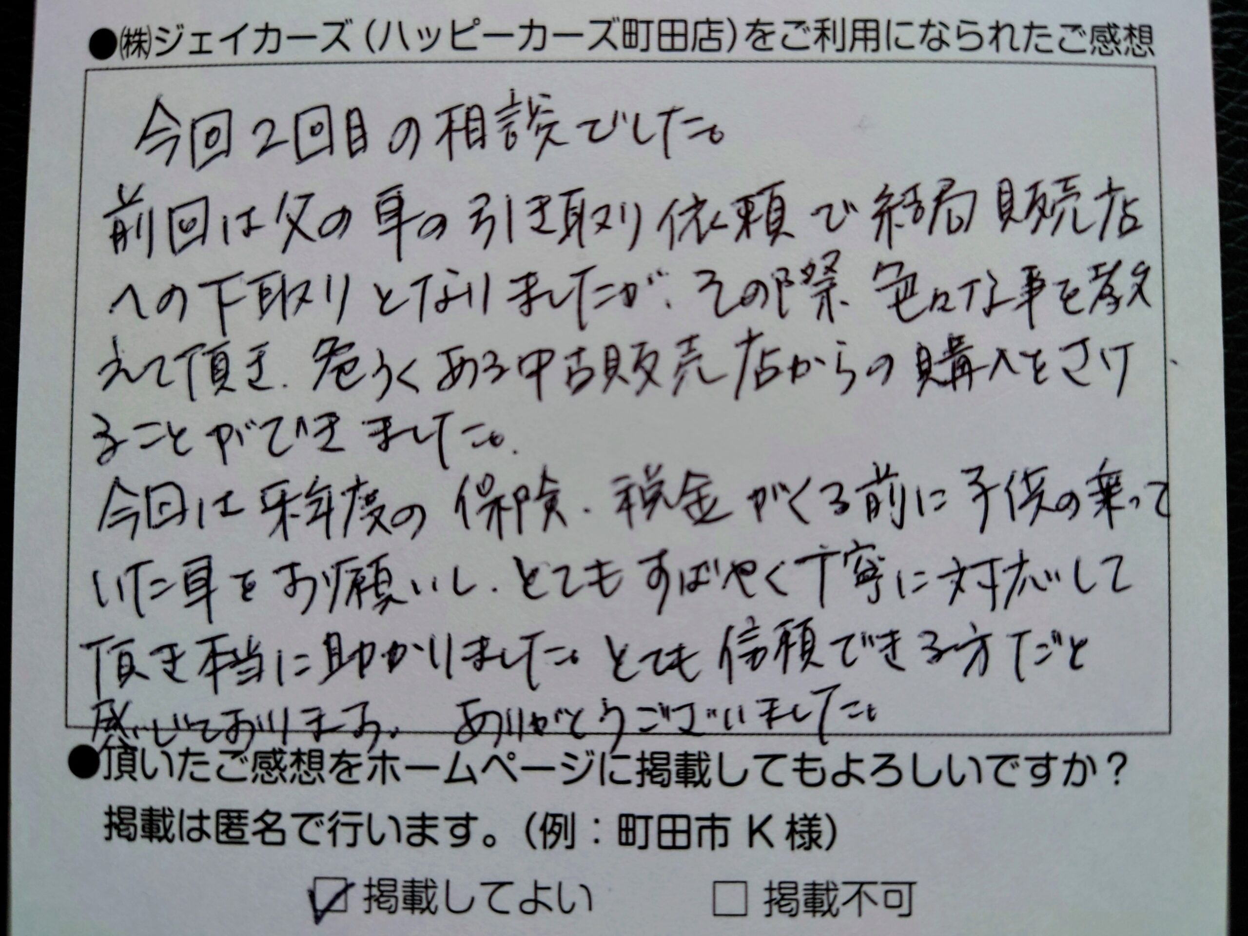 今回2回目の相談でした。 前回は父の車の引き取り依頼で結局販売店への下取りとなりましたが、その際色々な事を教えて頂き、危うくある中古車販売店からの購入をさけることができました。 今回は来年度の保険・税金がくる前に子供の乗っていた車をお願いし、とてもすばやく丁寧に対応して頂き本当に助かりました。とても信頼できる方だと感じております。ありがとうございました。