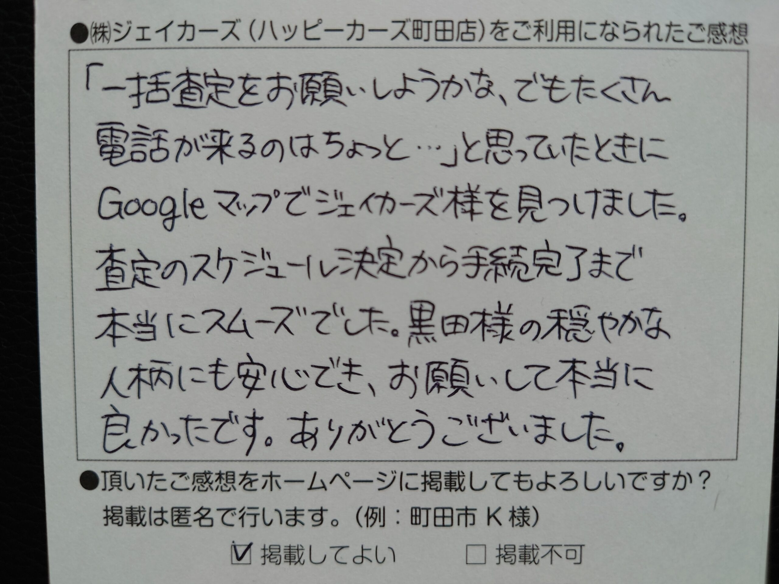車の売却は初めてで何も分からない中、不安でしたが黒田さんがとっても親身になってくださって、不安な気持ちがとても軽くなりました。感謝しています。